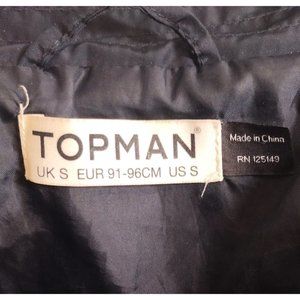 Very good condition Topman windbreaker jacket, blue with white ornate print. Has a hood and a collar. Men's size small, measures roughly 20" pit to pit and 25.5" from the bottom of the collar to the hem in the back. Really unique jacket.