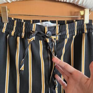 Pull on pants with an elastic waist and drawstring. Great condition, no puckering or snags.