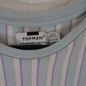 This Topman striped T-shirt in size XL features a stylish design with a soft, comfortable fit. The shirt has a light blue base color with white and purple stripes. It is in good condition, perfect for casual wear.