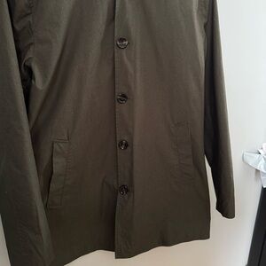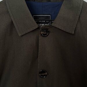 This is a lightweight trench coat from Topman that is a olive green color with light blue lining. It is oversized with side pockets and an interior breast pocket. This is pre-owned in excellent condition with no observable damage.