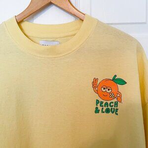 Scoop neck. Short sleeves. “Peach & Love” with peach graphic on front and back.