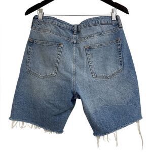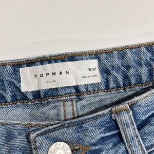 Stylish blue jean shorts by Topman. Features classic five-pocket design. Frayed hem for a trendy look.