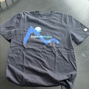 Black t-shirt featuring a blue graphic and Topo Designs logo.
