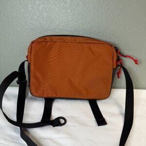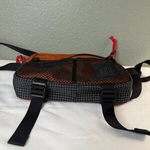 Topo Designs Block Bag in the color Clay comes with two exterior mesh pockets, two exterior zipper pockets with one interior zipper pocket. There are straps on the bottom to hold a water bottle or an extra layer.