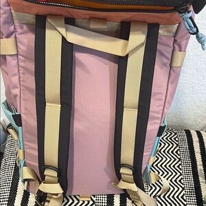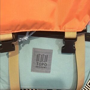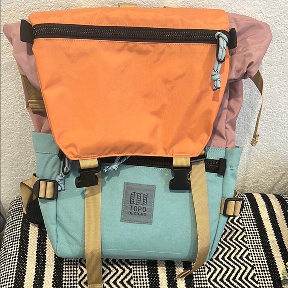 Bright and stylish backpack by Topo Designs. Features orange, pink, and blue hues. Ideal for daily adventures.