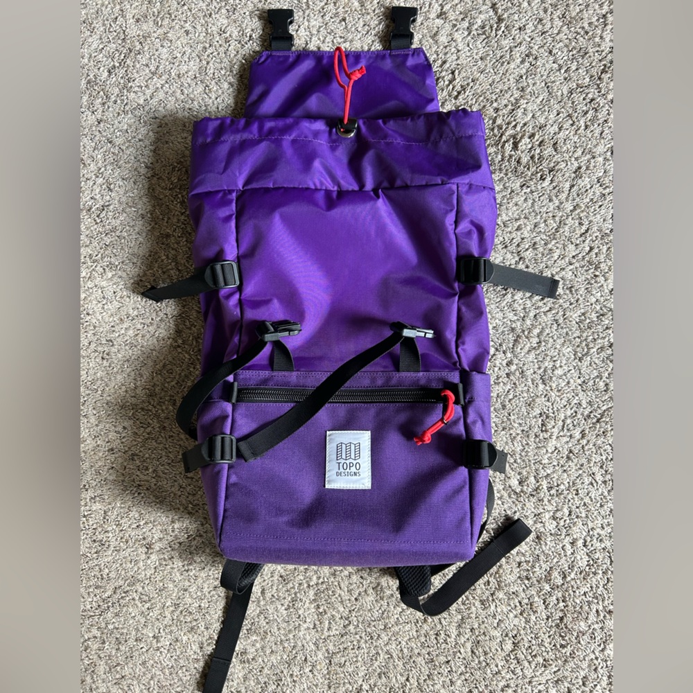 Barely used, like new Topo Designs Rover Classic. Can attach to the Global Travel Bag Roller! Roll top, with multiple inside and outside pockets.