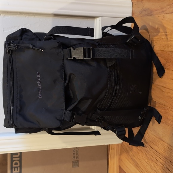 this is an older Topo Designs Rover pack in all black with a custom embroidered logo.