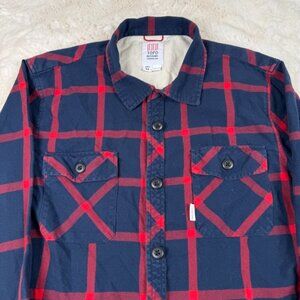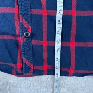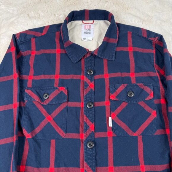 Topo Designs Shirt Mens Medium Blue Red Windowpane Flannel Loop Collar Button Up