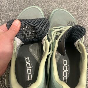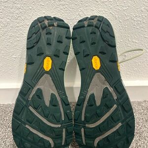 Trail runners with wide toe box and excellent arch support. Interior intact good used condition.