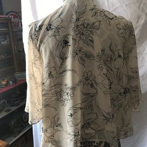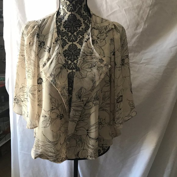 Delicate fawn-colored polyester topper, graphic black flowers on beige background, cascade front, cream-colored lining except in sleeves; sleeves 15" long; topper length 22"; hand wash.