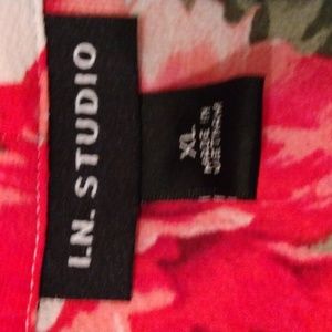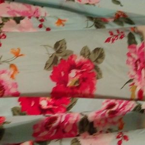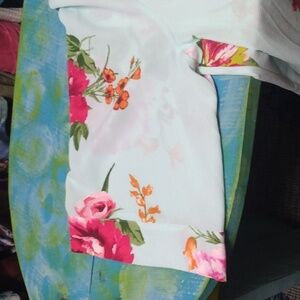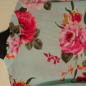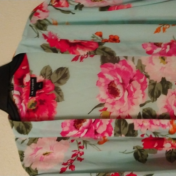 Open front topper. 3/4 sleeve. Aqua with pink and fuschia flowers. 23" across the back.33" from shoulder to hem.