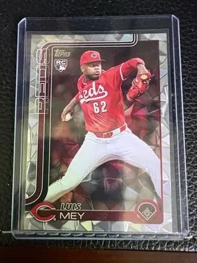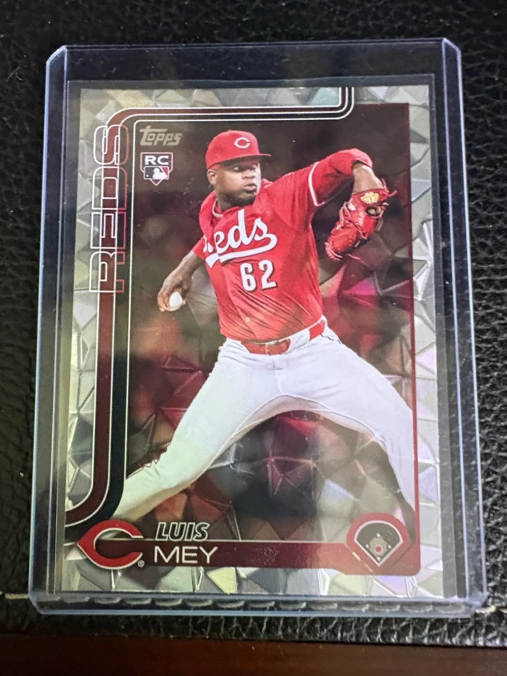 Topps baseball card featuring Luis Mey in Cincinnati Reds uniform. Bold red team colors dominate the design. Clean photographic player action shot. Distinct team logo and card accents visible.