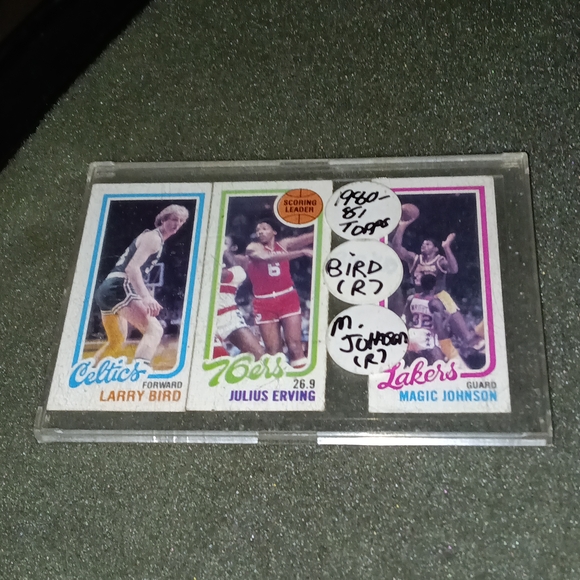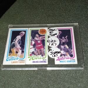 Collect the iconic Topps basketball trading cards featuring Larry Bird, Julius Erving, and Magic Johnson. Perfect for fans and collectors, this set showcases vibrant colors and legendary players.This is probably one of the best basketball rookies out there . It consists of 3 of the top greatest player and is the rookie card of LARRY BIRD and MAGIC JOHNSON. The card is in great shape except it's a perforated card and it was separated. It is in fantastic shape as can be seen. it retails for around 2000$