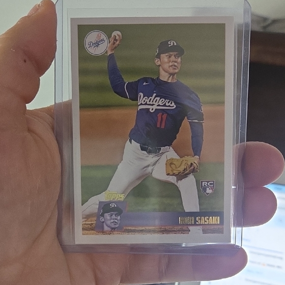 Topps card showcasing a Dodgers player in action. Blue and white uniform with a focused pose. Rookie Card Roki Sasaki
