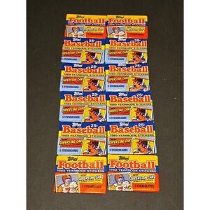 This lot contains 12 packs of Topps Football 1998 and Baseball 1989 sticker/cards. Each pack includes 68 cards featuring players from the Major League (MLB) baseball and football leagues. The cards are in English language and manufactured by Topps in 1989.