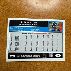 Topps card featuring Jason Elam. Includes kicking stats and team details.