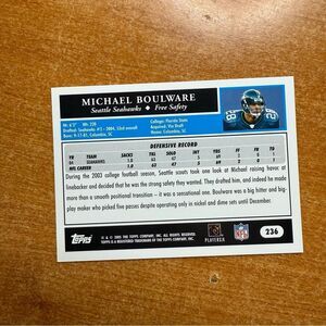 Topps card showcasing Michael Boulware from the Seattle Seahawks. Features blue and white design with player details.