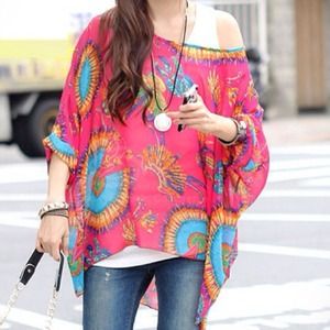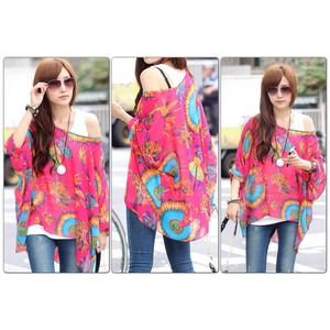 ON-HAND!!! Loose-Fitting Peacock Displays Pattern Batwing Sleeve Chiffon Blouse for Women