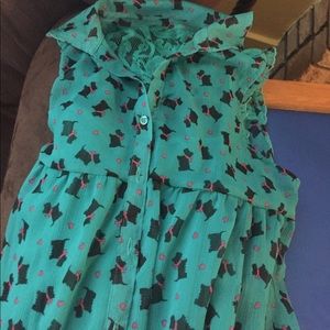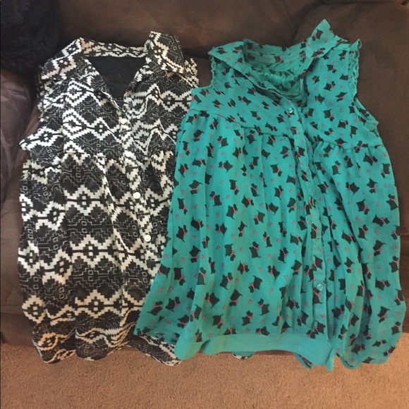 Two tops size 14-16 XL girls One top is black and white. The other top is blue with black dogs on it and this one has a tank top under it due to the color. In the back there is lace for style. Collared and sleeveless with button down❤️