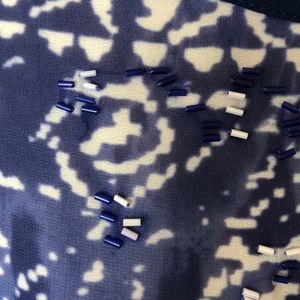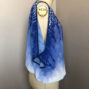 100% polyesters sheer tie dye wash with cold shoulders and sequins. Beautiful fabric, drapes very well. Light weight great for summer time! Bottom hem in elastic.