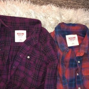 Selling TWO target flannels , both size Large . One purple and black , the other reddish orange , blue , green .