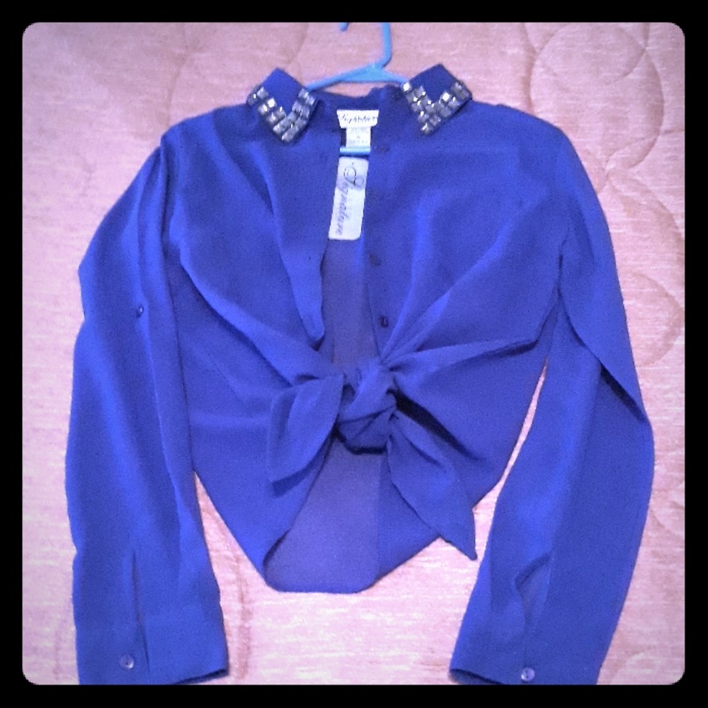 Blue Sheer Button Down Front Tie Up Blouse w/Rhinestones