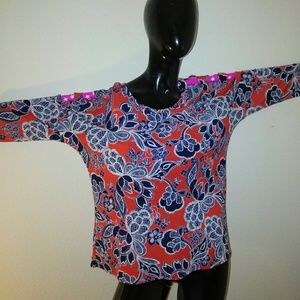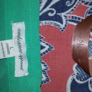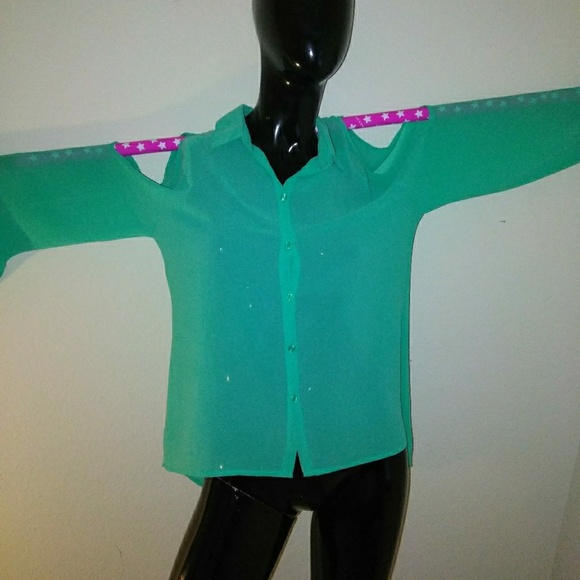 Peek a boo shoulders on both; lite green one is button down front shirt; very light almost see thru. Red one is over the head very comfortable. They both look good with either jeans or slacks! Both included! Both Lg!