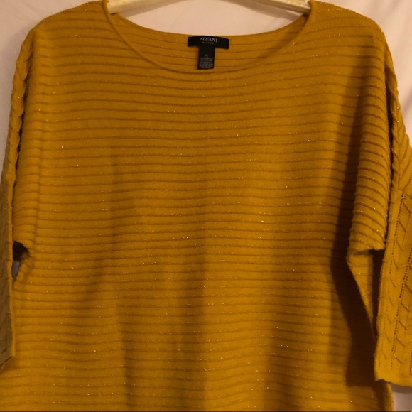 Gold ribbed sweater. 50% acrylic, 45% cotton, 2% metallic 3% other fibers.