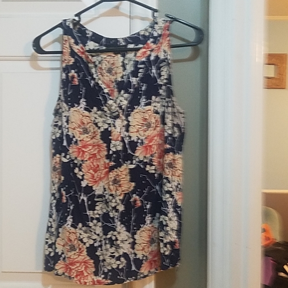 Navy and flower pattern blouse sleeveless with button v neck