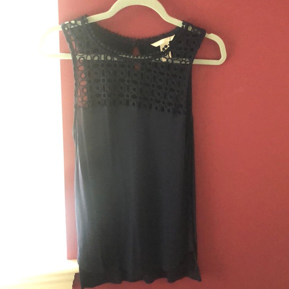 Sleeveless tops with open lace-work front. One cream. One navy.