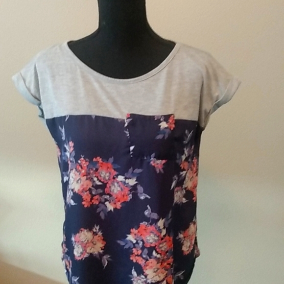 Slightly used tee shirt grey and blue the yoke is grey with the base is blue, very cute with jeans.