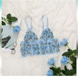 Floral Lace Bra for Women Deep V Sheer Mesh Bralette Wire Free Bra Breathable Crop Top with Spaghetti Straps Blue/Patchwork