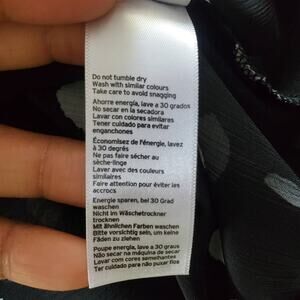 Tops polka dot mock turtleneck sheer top with a zipper closure in the back and bell sleeves with ties. There is a small hole under the right arm and a pull in the back. This beautiful top still has lots of life left for the right home, and comes from a smoke and pet-free home.