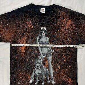 This cool 00s Fruit of the Loom tee has been distressed and bleached, and the bottom and sleeve hems have been cut off. The design has rhinestone accents, and the artist signed the tag.