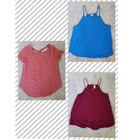 3 tops. 2 are soft cami type tanks. The blue one is a size M but it does run small so I that's why I put it with these 2 other tops which are both size Small. They are all in really good condition. They just need some love from an iron. I dont mind doing that before I ship, but with the material they are I figured they will just end up at your door step wrinkled again from shipping.