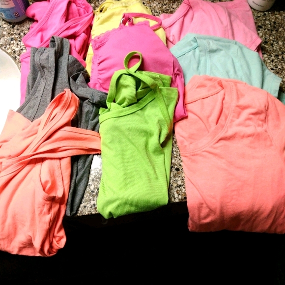 Top bundle size small or xsmall. 3 short sleeve shirts, 3 spaghetti strap tops and 3 tank tops. Last tank top does have stains