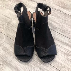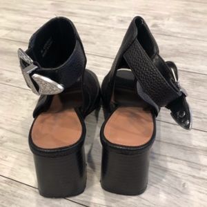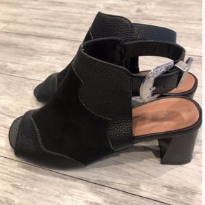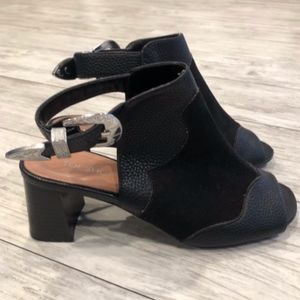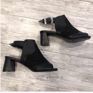 Western style cut, ankle buckle closure, open toe, sling back. Comfortable short heel for everyday use. heel height 2.5” Size 36