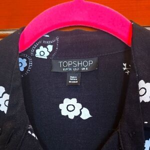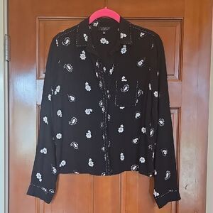 Stylish black button down shirt with white floral patterns. Features a classic collar and front pocket. Perfect for casual or formal wear. White Stitching.