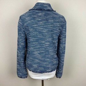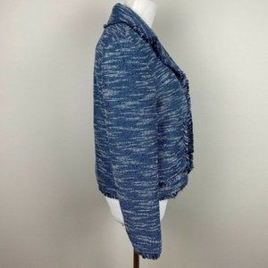 Long sleeve open front tweed blazer jacket. Blue with white knit. Fringe trim. Front pockets.