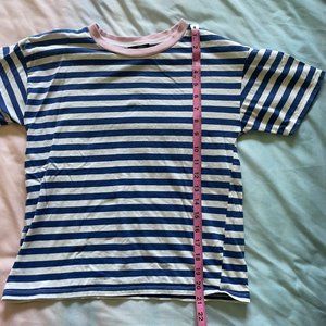 This super cute tee shirt features bold blue and white stripes and a pale pink collar. It is cotton.
