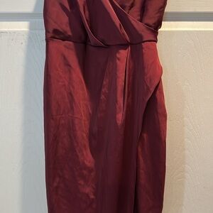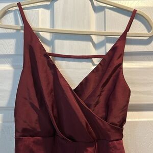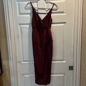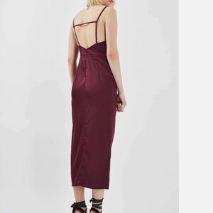 Gently worn Topshop Burgundy Satin Faux Wrap Thigh Slit Midi Dress women’s size 2. Polyester satin material, burgundy, faux wrap style, v-neck in front, high thigh slit, rear zipper, strap across back-low plunge, midi length. Offers accepted!