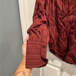 Elevate your style with this elegant burgundy striped button down shirt. Perfect for any occasion, this shirt offers a sophisticated look with its rich color and classic design.