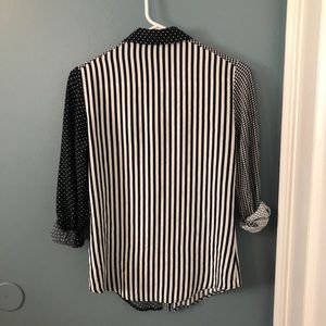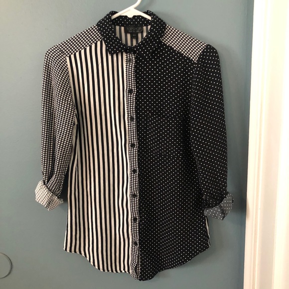 Really cute button down top from Topshop with “patchwork” style combination of prints. The fabric is light and pretty stretchy. Fits like an xs or xxs. Hardly worn!