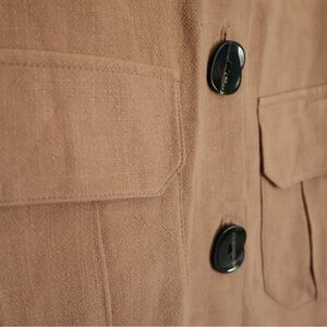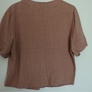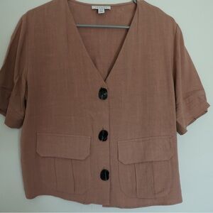 Stylish rust/mauve button down shirt. Features short sleeves and front pockets. Perfect for casual wear.