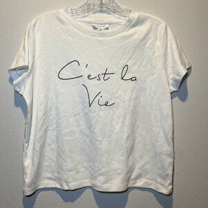 White Topshop tee with "C'est la Vie" written in thin black velvet writing. Cropped. Tag listed as US 14 but fits like an L