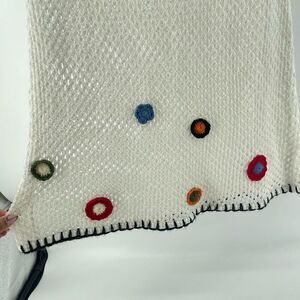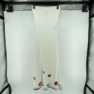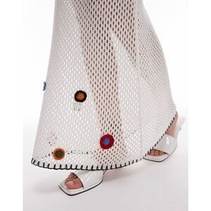 This Topshop cream maxi skirt is a dreamy blend of vintage-inspired charm and modern elegance. Made with a fully open knit design, it features delicate crochet-style floral doilies along the hem for a soft, boho finish. The elastic waistband and gentle A-line silhouette offer comfort and ease of movement while maintaining a flattering shape.