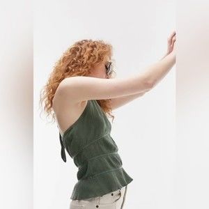 A tiered bodice adds definition to this on-trend halter top crafted from a crinkled cotton blend.