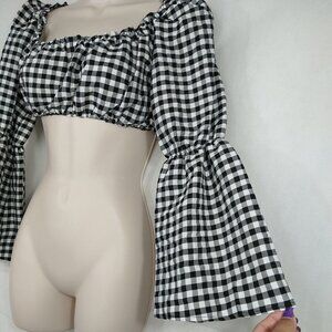 Topshop Black White Gingham Plaid Crop Top with Bell Sleeve