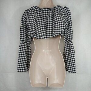 Topshop Crop Top Women Size 0P Black White Gingham Plaid Bell Sleeve NEW