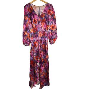 Topshop Dress Satin Floral Long Sleeve V-Neck Ruffle Midi in Bright Pink NWT 4